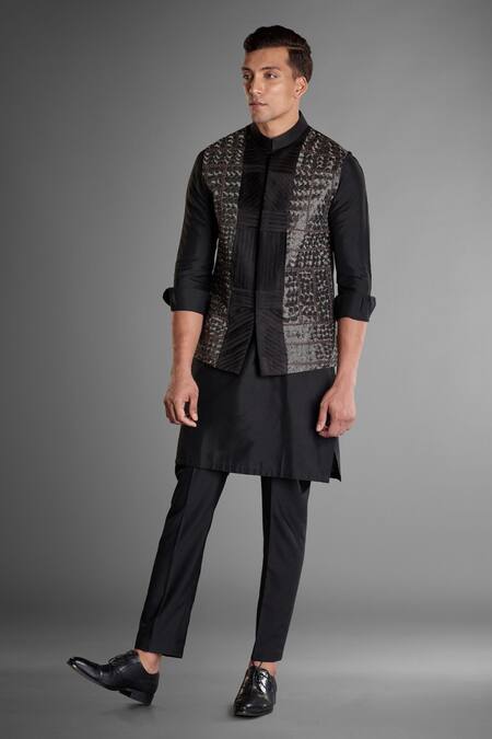 Black bundi crafted in silk linen featuring scallop zari work and geometric pattern pleats