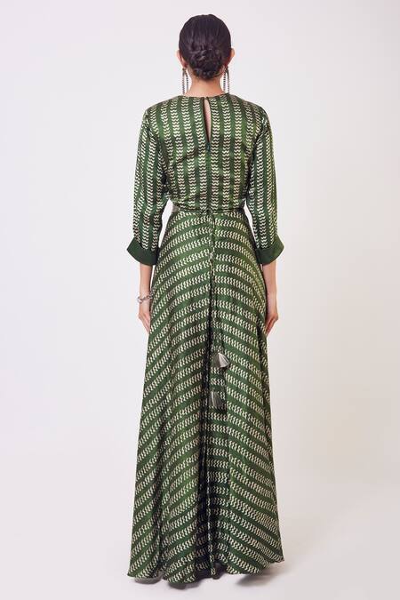 Green jumpsuit in satin fabric base & geometric print pattern.