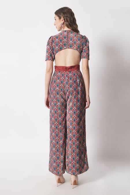 Blue and pink jumpsuit featuring a V neck and half sleeves with a back cut-out
