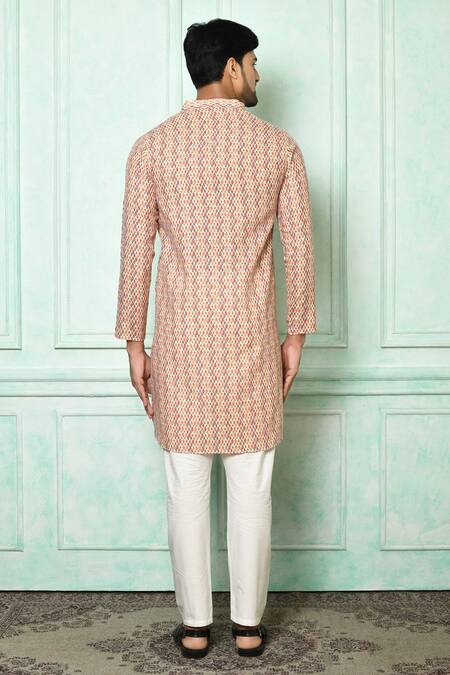 Multi color cotton geometric printed kurta with mandarin collar. Paired with cream aligarh pyjama.