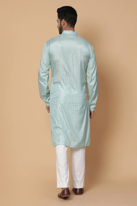 Sky blue kurta with geometric printed motifs. Comes with off-white pant.