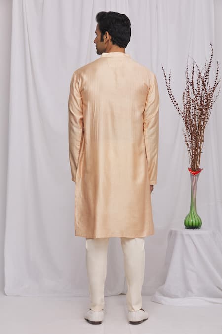 Peach kurta with geometric print & front buttons. Paired with ivory trouser.