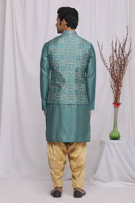 Teal blue Nehru jacket with geometric printed motifs, welt & patch pocket.