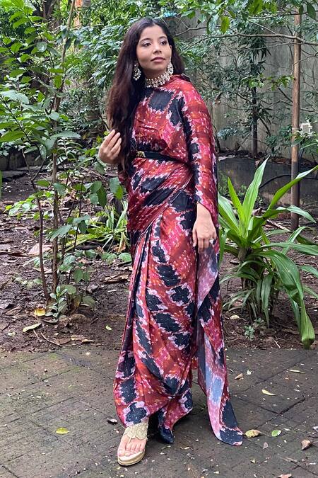 Red pre-stitched saree featuring a geometric digital print and classic collar pallu. Paired with a matching blouse and embellished fabric belt.