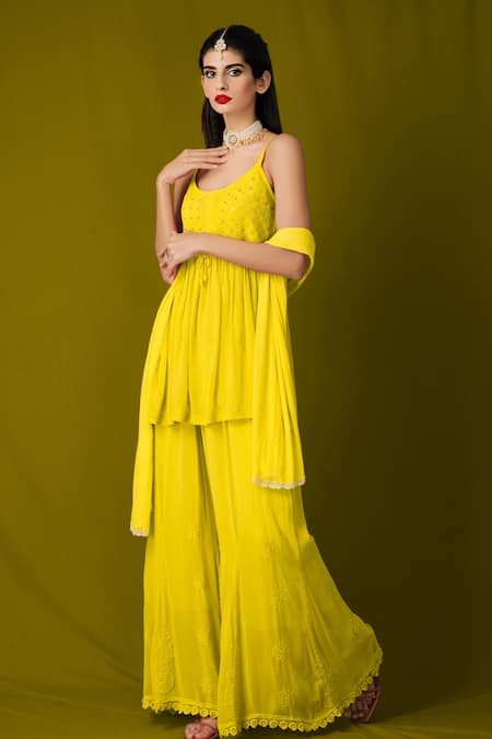 Buy_LABEL AISHWARYRIKA_Yellow Georgette Chikankari, Mukaish Scoop Neck Short Kurta _at_Aza_Fashions