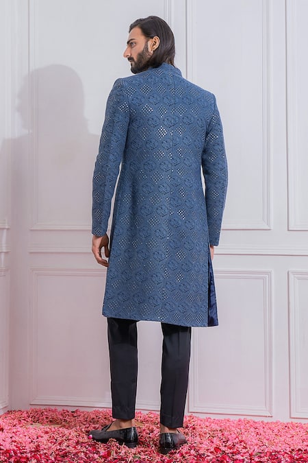 Blue Pure Georgette, Satin Linen Sequin Front Open Sherwani And Kurta Set