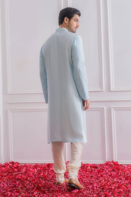 Powder blue pure georgette kurta with mirror work embroidery & mandarin collar. Paired with ivory churidar.