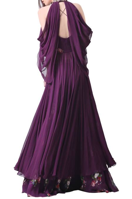 Purple Georgette Printed Floral Motifs Sweetheart Neck Cape And Palazzo Set