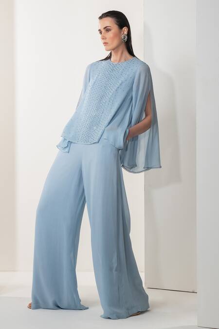 Cyan blue georgette jumpsuit with sequin work & split sleeves.