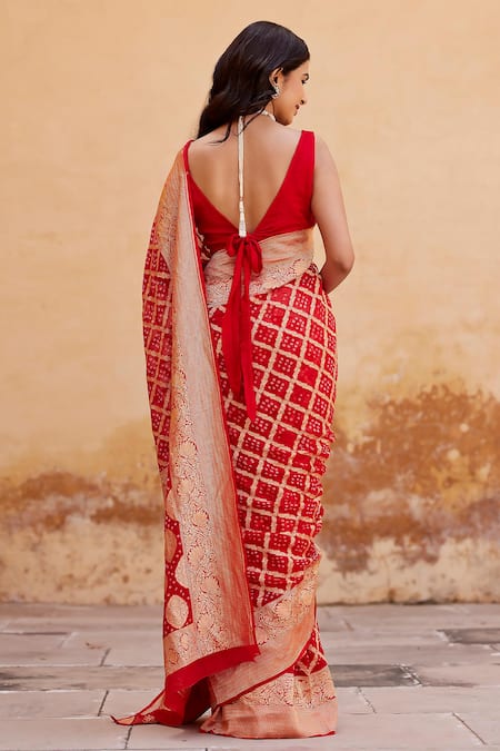 Red saree featuring a tie-dye bandhani pattern with floral zari handwoven motifs. Accompanied by unstitched blouse fabric.