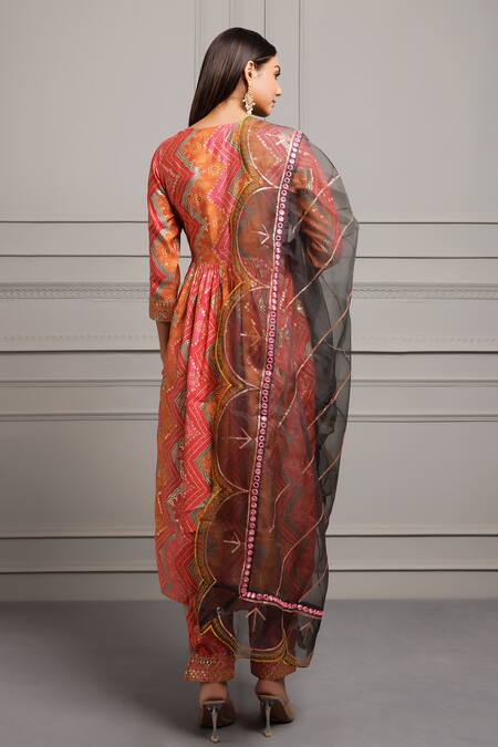 Pink Silk, Organza Embroidery, Sequins Round Neck Bandhani Print Kurta Pant Set