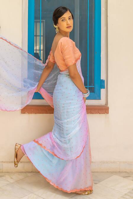 Handcrafted mirror work, Resham embroidery detailing, Saree features scalloped edges