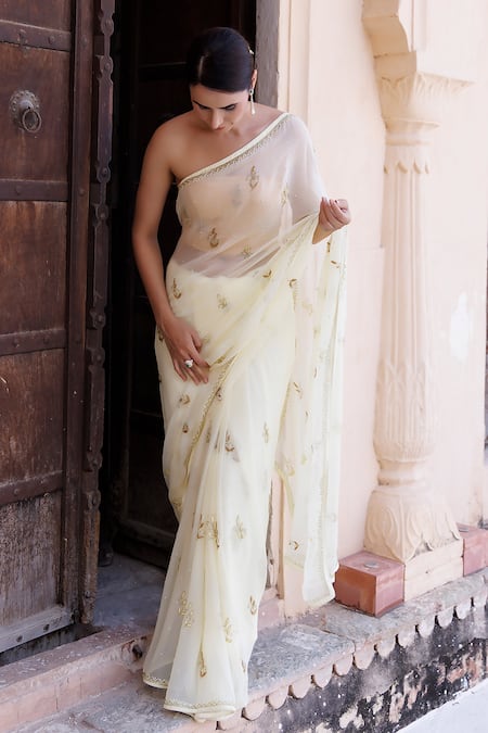 Cream chiffon saree featuring hand embroidery with resham and tube work in floral patterns. Paired with an unstitched blouse piece, this piece showcases the elegance of traditional craftsmanship.