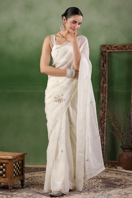White chiffon saree featuring floral vine embroidery with sequins, aari, and tube light work. Paired with an unstitched blouse piece measuring 90 cms.