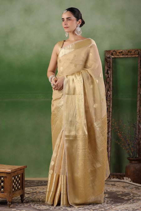 Beige Tissue Embroidery Floral Butti Pattern Saree With Unstitched Blouse Piece