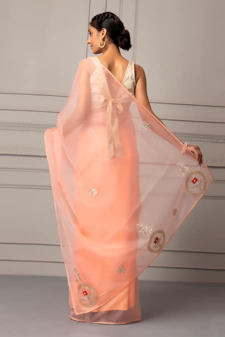 Peach organza saree featuring hand embroidered gota patti work on the pallu. Accompanied by a matching unstitched blouse piece.