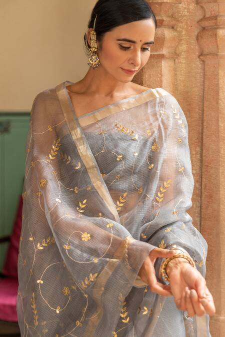 Grey saree featuring floral gota patti work motifs and a zari border. Comes with unstitched blouse fabric.