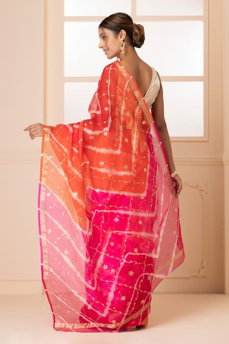 Multicolor saree featuring floral gota patti work motifs and zari border. Comes with unstitched blouse fabric.