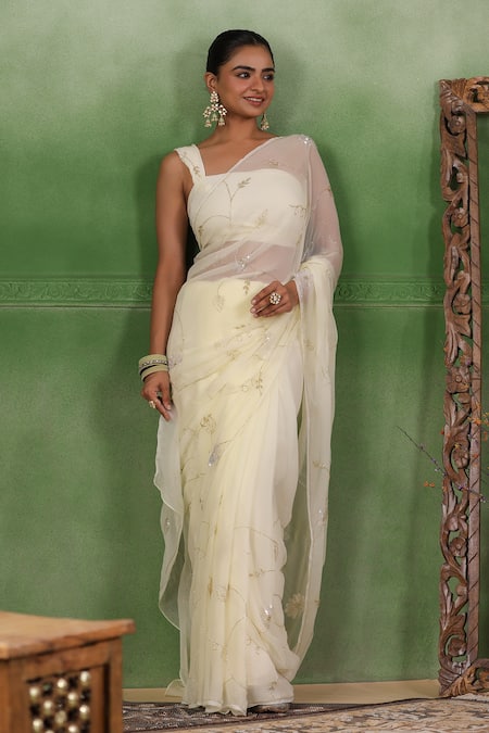 Off white sheer saree featuring floral vine embroidery with sequins and aari work. Comes with an unstitched blouse piece measuring 90 cm.