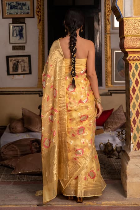 Yellow saree crafted from pure Kota silk featuring intricate floral woven motifs. Paired with unstitched blouse fabric, highlighting traditional craftsmanship.