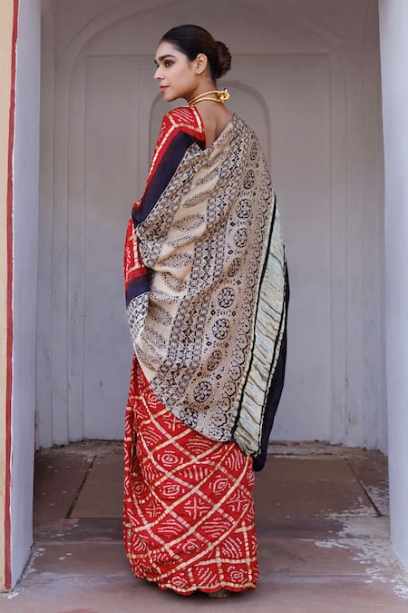 Red gajji silk saree featuring ajrakh hand block print and zari pallu. Includes an unstitched blouse piece with ajrakh hand block print design.