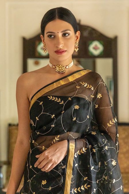 Black saree featuring floral gota patti work motifs in a pure Kota silk fabric. Comes with unstitched blouse fabric.