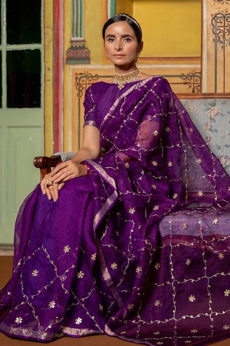 Purple saree featuring floral gota patti work motifs and a zari border. Comes with unstitched blouse fabric for customization.