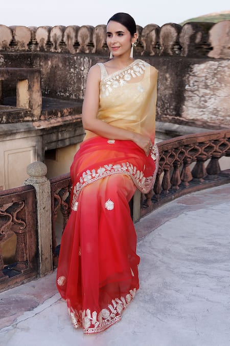 Yellow and orange ombre saree in organza featuring hand embroidered floral patterns and contrast gota work. Comes with an unstitched blouse piece.
