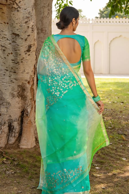 Blue and green saree featuring floral pittan, gota patti, and mirror work. Paired with unstitched blouse fabric in pure Kota silk.