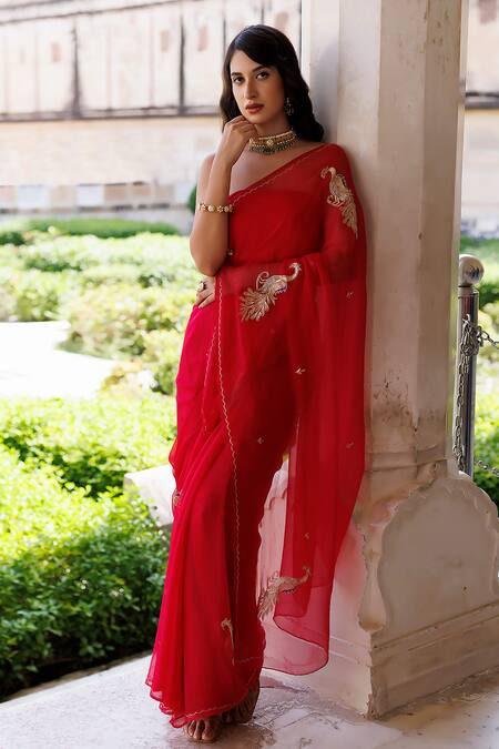 Fuchsia chiffon saree featuring hand embroidery with peacock motifs in aari and tube work. Comes with an unstitched blouse piece for customization.