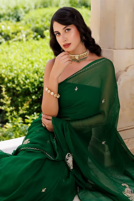 Green chiffon saree featuring hand embroidered peacock motifs with aari and tube work. Comes with an unstitched blouse piece.