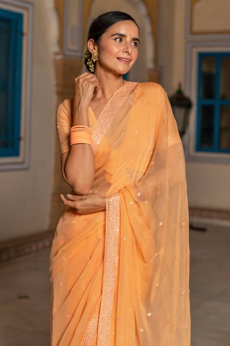 Peach chiffon saree featuring handcrafted mirror work and resham embroidery. Comes with an unstitched blouse piece.