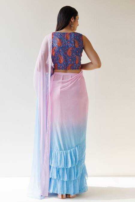 Blue and pink pre-draped saree featuring an ombre design with ruffles on the hemline. Accompanied by a printed unstitched blouse piece.