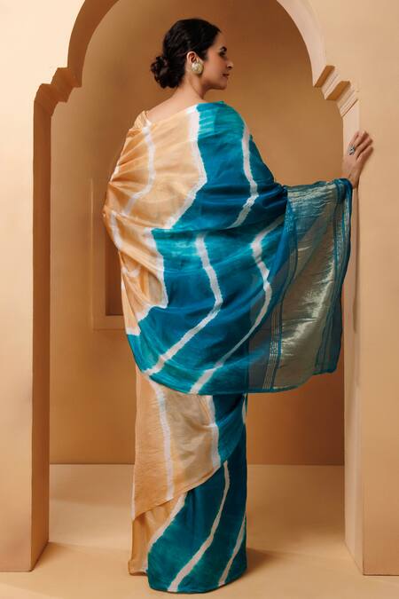 Beige and turquoise blue leheriya saree featuring hand block pattern and zari detailing. Accompanied by an unstitched blouse piece for customization.