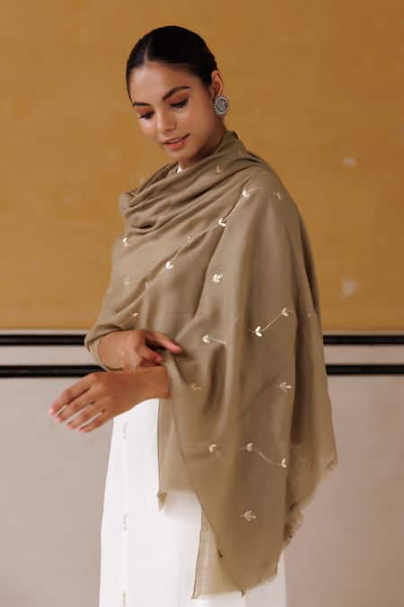 Green wool shawl featuring intricate gotapatti embroidery in a jaal pattern