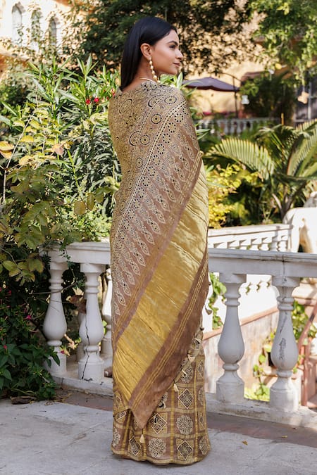 Brown gharchola saree featuring a woven zari checkered pattern with floral geometric ajrakh prints. Comes with an unstitched blouse fabric for customization.