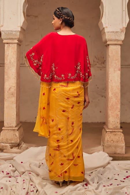 Yellow hand embroidered chiffon saree featuring heavy embroidery and a drawstring closure. Paired with a striking red silk cape embellished with sequins, tubelight, and pearls.