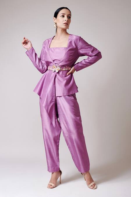Purple Raw Silk Solid Bustier Square Asymmetric Jacket With Pant Set