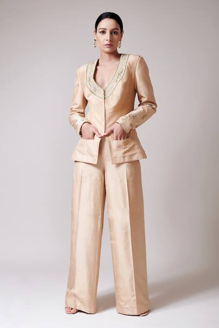 Beige Raw Silk Embroidered Floral Pattern Jacket Plunge With Pant Set