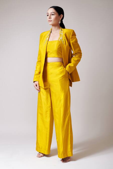 Bright yellow jacket in raw silk base with floral embroidered lapel. Comes with bustier & pant.