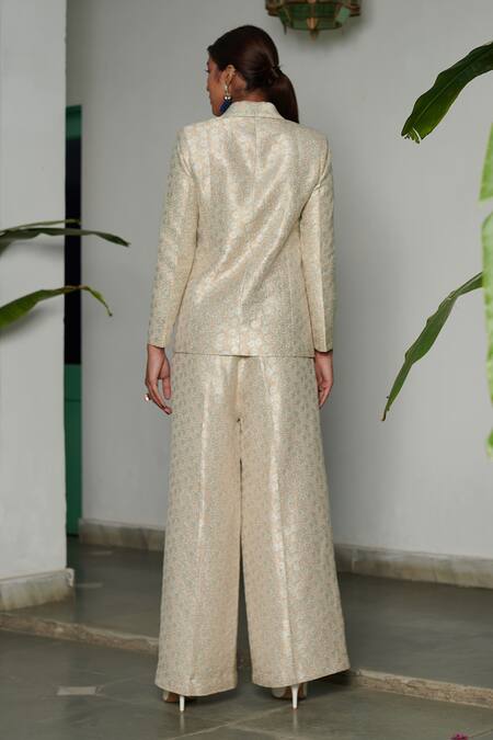 White Silk, Brocade Floral Pattern Lapel Handwoven Jacket With Flared Pant Set