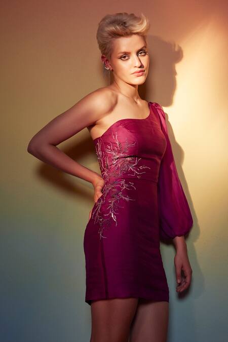 Wine dress featuring an asymmetric neckline and one shoulder balloon sleeve