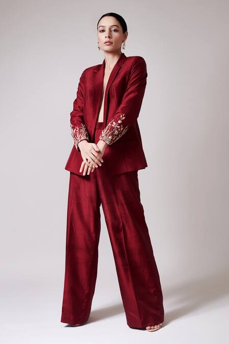 Maroon jacket in raw silk base with floral embroidered sleeves. Comes with bustier & pant.