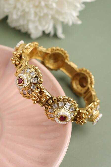 22k gold toned bangle embellished with kundan, pearl detailing and ghungroo drops.