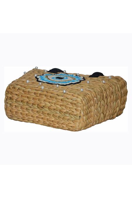 Blue bead embroidered Evil Eye motif, Scattered pearl embellishments, Structured handle for easy carrying