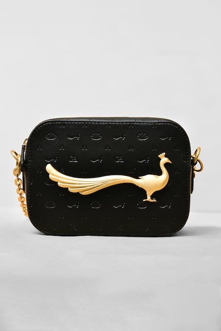 Black leather box bag featuring an embossed design and a golden peacock motif. It includes an attached chain strap for easy carrying.