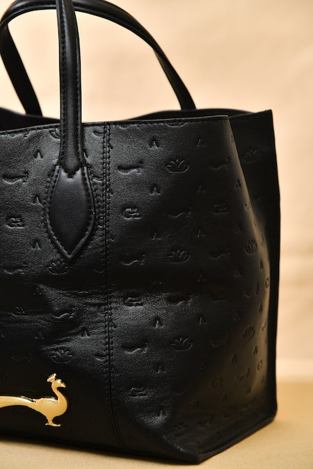 Black leather handbag featuring embossed patterns and a golden peacock motif. It has an attached handle for easy carrying.