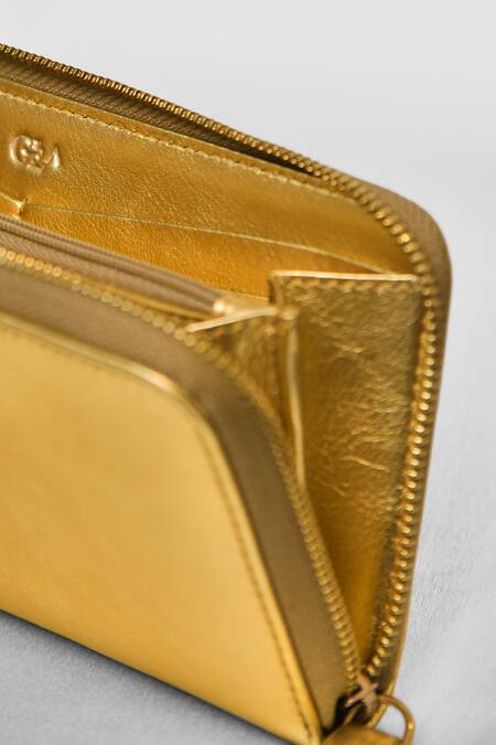 Gold leather wallet featuring a peacock embellishment