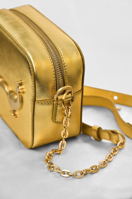 Gold cross body bag featuring a peacock motif embellishment. Crafted from leather with a structured design for durability.