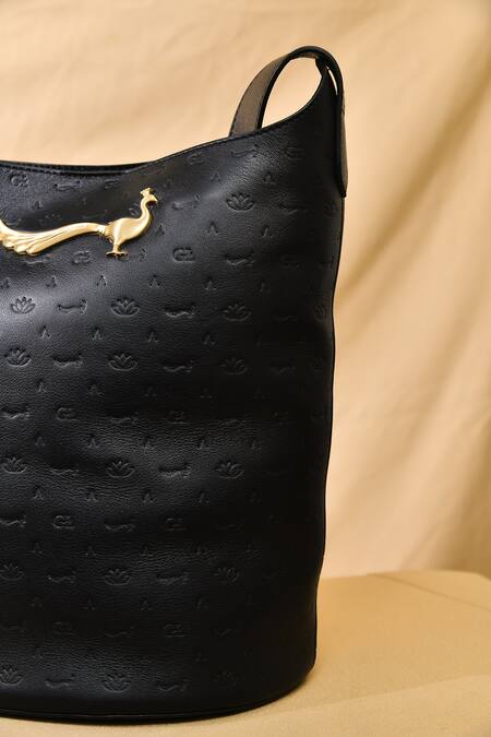 Black leather handbag featuring floral embossing and a gold-toned peacock embellishment